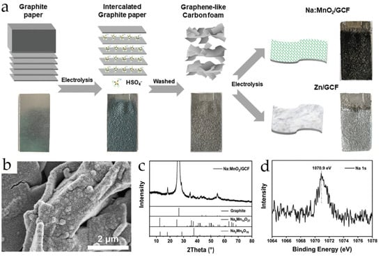 (a) The synthesis scheme of the GCF from the raw graphite paper and the photographs of the samples through the synthesis route. (b) The surface SEM of the Na:MnO2/GCF electrode. (c) XRD patterns of the Na:MnO2/GCF electrode. (d) Na 1s core-level XPS spectra of the Na:MnO2/GCF electrode [33].