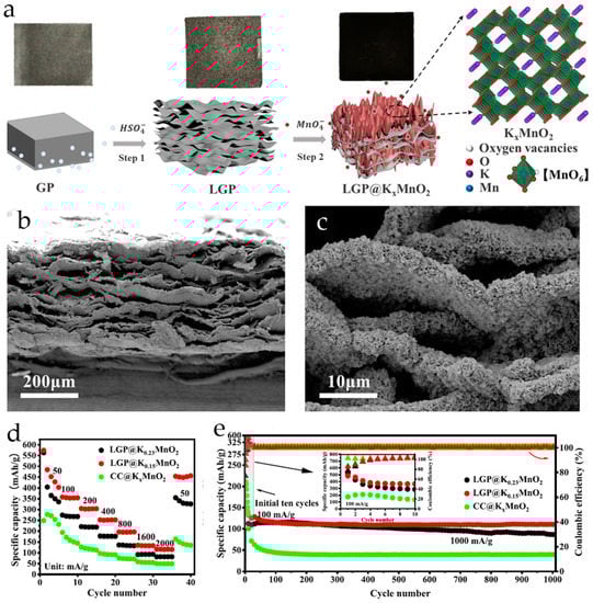 (a) Scheme of the preparation process of LGP and synthesis of LGP@KxMnO2. (b,c) The cross-sectional SEM images of LGP@K0.15MnO2. (d) Rate performance and (e) cycling stability and coulombic efficiency at 1000 mA/g of K-doped MnO2 grown on the layered graphite paper and carbon cloth [38].