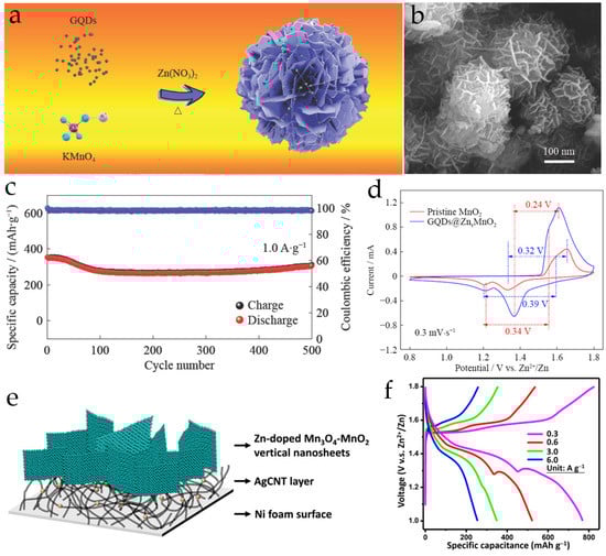 (a) Scheme of the synthesis route for GQDs@ZnxMnO2 composite [42]. (b) SEM image of GQDs@ZnxMnO2 [42]. (c) Long-term cycling of GQDs@ZnxMnO2 electrode [42]. (d) Comparison of the cyclic voltammograms for pristine MnO2 and GQDs@ZnxMnO2 cathodes [42]. (e) Schematic illustration of the structure of fabricated Zn-doped mixed Mn3O4-MnO2 nanosheets on the AgCNT- modified Ni foam [27]. (f) Galvanostatic charging/discharging profiles of Zn-doped Mn3O4-MnO2 vertical nanosheets [27].