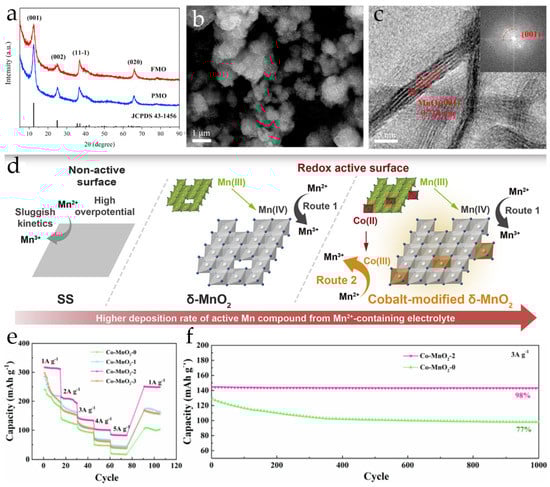 (a) XRD spectra of pristine MnO2 and FMO [44]. (b) SEM image of FMO [44]; (c) HRTEM image of FMO [44]. (d) The mechanism of the catalysis effect in Co-modified δ-MnO2 [45]. (e) Rate performance of plasma-treated Co-MnO2-X (X = treatment time) at current densities 1–5 A∙g−1 [29]. (f) Cycling performance of Co-MnO2-0 and Co-MnO2-2 at 3 A∙g−1 [29].
