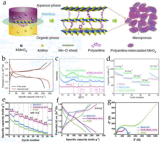 (a) Scheme of the reaction between aniline and potassium permanganate and the expanded structure of PANI-intercalated MnO2 nanolayers [66]. (b) Typical galvanostatic charge/discharge curves of PANI-intercalated MnO2 cathode at 0.05 A∙g−1 [66]. (c) XRD patterns and (d) C-rate capabilities of MnO2, MnO2/rGO, and MnO2/rGO/PANI composites [67]. (e) Rate performance and (f) Galvanostatic discharge/charge curves of MnO2/CC, PANI-MnO2/CC and PANI [68]. (g) Nyquist plots for MnO2/CC, PANI-MnO2/CC, and PANI [68].