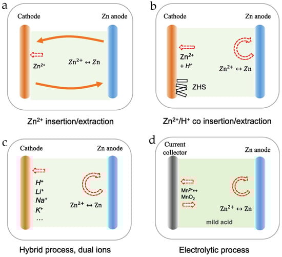 Since 1991, lithium-ion batteries have been at the forefront of modern science and technology in the field of energy storage materials due to their high energy density. Nevertheless, their recycling is still a global problem due to the high cost and insufficient efficiency of these processes [1,2]. In fact, the development of clean and safe metal-ion batteries with a low cost, high energy efficiency and cycle stability, and environmental friendliness, the so-called “beyond Li-ion batteries”, has attracted global attention. Among such batteries, aqueous zinc-ion batteries (AZIBs) are state-of-the-art due to their high zinc abundance, high volumetric and gravimetric theoretical capacity values (5854 mAh·cm–3 and 820 mAh·g−1), safety, and non-flammability [3,4,5,6,7]. In addition, metallic Zn has a comparatively low redox potential (−0.76 V vs. Standard Hydrogen Electrode (SHE)), is non-toxic, and is inexpensive.