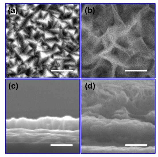 According to the literature, Cu2O films were fabricated by an electro-deposition method [32]. As-prepared Cu2O films were subsequently treated with different CV cycles in the potential range from −0.06 VRHE to 1.14 VRHE. To evaluate the influence of voltage cycling on the morphology of Cu2O, SEM images were compared. Since the surface morphology of the Cu2O treated with 50, 100, 200 and 300 voltage cycles are similar (Figure S1), the Cu2O treated with 200 voltage cycles was chosen as a typical sample to compare with the as-prepared Cu2O in the following paragraphs. In Figure 1a, the as-prepared Cu2O shows a dense morphology with pyramidical grains exposed on the surface, similar to the typical morphology of Cu2O fabricated by the electro-deposition method in the literature [32]. The thickness of the as-prepared Cu2O is about 710 nm (Figure 1c). After 200 voltage cycles, the surface of the Cu2O is covered in wrinkled nanosheets (Figure 1b), demonstrating that chemical reactions occurred during the voltage cycles. In Figure 1d, the Cu2O treated with 200 voltage cycles shows a bilayer cross-sectional structure with a 700 nm thick dense film on the bottom and wrinkled nanosheets on the top. The results of SEM images suggest that a heterostructure was formed on the surface of Cu2O through CV cycling.