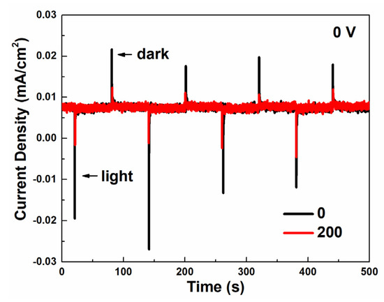 The photo-charge and dark-discharge current-density curves were measured in a two-electrode system to test the photocapacitive performance under a zero-bias condition. As depicted in Figure 4, both samples show a photo-charge and dark-discharge ability under zero-bias. The as-prepared Cu2O indicates a photo-charge current density of 0.025 mA/cm2 and a dark-discharge current density of 0.013 mA/cm2, higher than that of Cu2O treated with 200 voltage cycles. To explain this phenomenon, the band position and Fermi level of the Cu2O/CuO heterostructure was determined by Mott–Schottky analysis (Figure S10) and UV–vis absorption spectra (Figure S11), according to the method in the literature [35]. As shown in Figure S10, the flat-band potentials of Cu2O and CuO are estimated as 0.46 VRHE and 0.41 VRHE, respectively, both lower than the flat-band potential of bare FTO (0.3 VRHE, Figure S12). The carrier concentrations of Cu2O and CuO are calculated as 6.1 × 1018 cm−3 and 3.1 × 1018 cm−3, respectively. The band gap of Cu2O is about 2.1 eV (Figure S11). As a result, a staggered type-II p–n junction was formed between Cu2O and CuO. As demonstrated in Figure 3a,b, the reduction reaction of H+/H2 cannot happen on both the as-prepared Cu2O and Cu2O treated with 200 voltage cycles under a zero-bias condition. Therefore, the photo-charge and dark-discharge current density observed in Figure 4 is attributed to the redox reaction of Cu2+/Cu+.