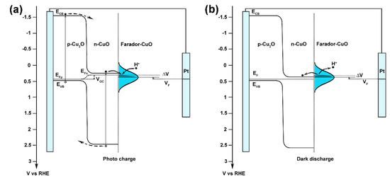 Recently, Luo and co-workers developed a novel concept of Faradaic junction [34,36,37,38,39,40]. In photo-rechargeable devices, Faradaic junction provides a platform for ion and electron storage with a carrier-transporting character different from the traditional p–n junction [38]. Adopting this concept, a possible mechanism for the photo-charge and dark-discharge phenomenon on Cu2O/CuO heterostructures under zero-bias is proposed in Figure 5. In our proposal, the CuO layer near the surface of Cu2O works as an n-type semiconductor, while the CuO layer near the electrolyte acts as a Faradaic material, which can store/release the ions and electrons. Under illumination, the quasi-Fermi level in the CuO semiconductor shifts negatively and higher than the Fermi level of the CuO Faradaic layer, which leads to photo-generated electrons in the Cu2O/CuO heterostructure and the H+ ions’ in electrolyte injecting into the CuO Faradaic layer, showing a negative photo-charge current. When the light is off, the Voc in the Cu2O/CuO heterostructure disappears, and the Fermi level in CuO is lower than the Fermi level of the CuO Faradaic layer, causing a positive dark-discharge current. To support this proposal, the Fermi level of the CuO Faradaic layer was measured with a photo-charge and dark-discharge CV scan, showing an equilibrium potential at 0.45 VRHE (Figure S13). The higher photo-charge and dark-discharge current density of the as-prepared Cu2O is attributed to the lower hole–electron recombination rate in a thinner CuO semiconducting layer.