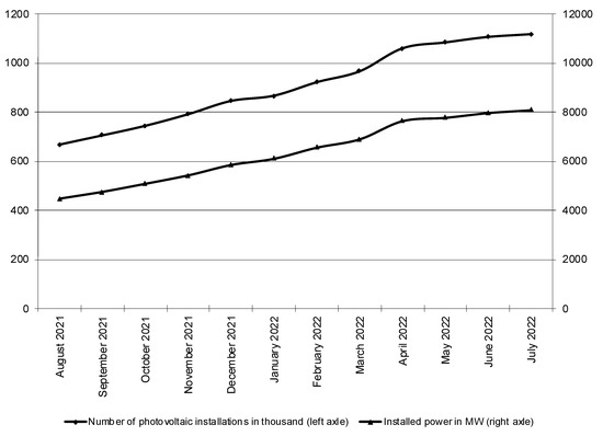 Number (thsnd) of photovoltaic installations in Poland and their capacity from August 2021 to July 2022. Source: author’s work based on Energy Market Agency [56,57].