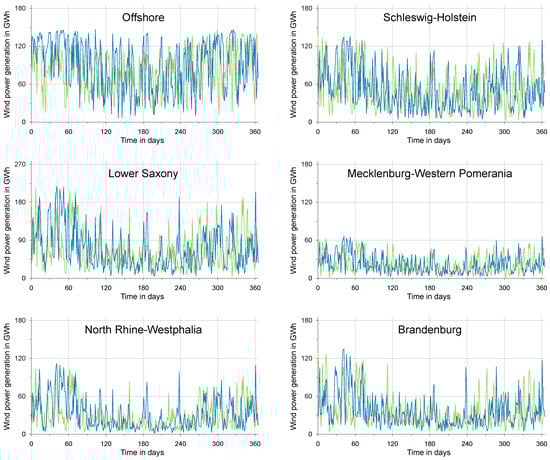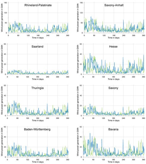 Local and regional advances in the transformation of the electricity sector towards a higher share of wind energy can be reliably tracked by the spatiotemporal distribution of wind turbines and their power generation. Thus, the simulation results generated in this study may help to better monitor the German energy transition. As an example of application at the regional scale, Figure 6 shows the power generation from offshore turbines and onshore turbines at NUTS-1 level with a daily resolution. Particularly at this spatial level, many political decisions and regulations are made in Germany which have a major impact on the decarbonization of the energy system and the speed of its implementation.