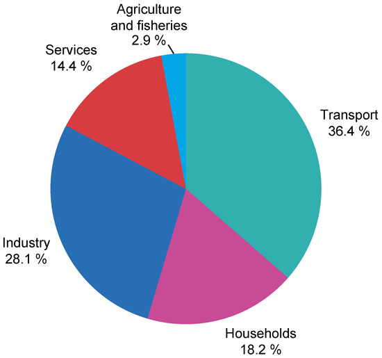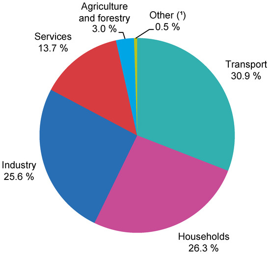 Final energy consumption by sector in the EU in 2019 expressed as a percentage of the total and based on tons of oil equivalent. The authors created this figure using data from Eurostat [1]. Notes: (1) International aviation and maritime bunkers are excluded from the Transport category.