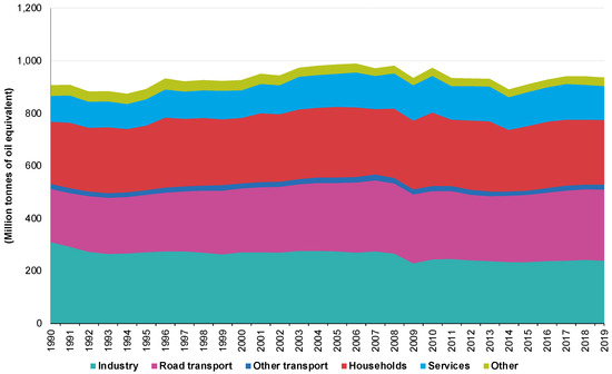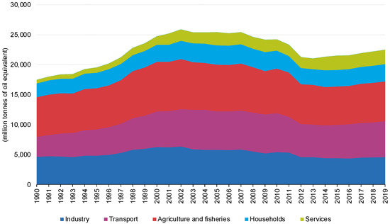 Final energy consumption by sector in the EU from 1990 to 2019, measured in million tons of oil equivalent. The authors created this figure using data from Eurostat [1].
