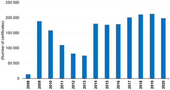Regarding Portugal, the subject of our investigation, all new buildings since July 2008 must possess a valid energy performance certificate, while existing buildings have had one since 2009. With the introduction of Decree-Law no. 118/2013 in Portugal, which follows Directive (2010/31/EU), the EPC became mandatory when signing the sale, rental, or lease contract. The number of certificates issued in Portugal was 13,798 in 2008, which more than doubled in 2009, reaching 188,716 certificates. However, the count declined significantly between 2011 and 2013, bottoming at 74,969 in 2013. It can be attributed to the financial and economic crisis that affected Portugal as one of the hardest-hit countries in the EU. Nevertheless, the number of new certificates recorded has increased since 2014, and in 2020, 198,091 certificates were issued (see Figure 3 below).
