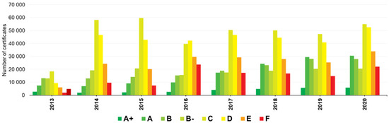 Energy performance certificates issued in Portugal during 2008–2020. The authors created this figure with data from Observatório da Energia [19]. Notes: During 2008–2013, they included A+, A, B, B-, C, D, E, F, and G certificates, while during 2014–2020, they included the A+, A, B, B-, C, D, E, and F certificates. The EPC with rating G was discontinued in 2014.
