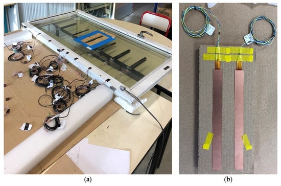 The heat flux sensors used were Captec™ sensors with tangential gradients (Leclercq and Thery) [30,31]. The underlying operating principle is based on the Seebeck thermoelectric effect and relies on a temperature difference, generated in the plane of the sensor, from which a thermal flux measurement can be obtained. Thanks to this principle, the advantage of a reduced thickness (a few tenths of a millimeter) is therefore gained while maintaining high sensitivity (a few tens of microvolts per W/m2). This set-up makes it possible to place heat flux meters in the air gaps without the measurement step becoming too intrusive. Each flux meter has a surface area of 40 cm2 (2 cm × 20 cm); moreover, they are only mounted to those walls without a low emissive coating by means of “spray-on” glue. The integration of the heat flux and temperature sensors was carried out with great precision in order to avoid deformation of the sensors during their insertion into the window. The various heat flux meters were also covered with a matt black paint, thus making it possible to obtain homogeneous emissivity at the sensor surface close to that of glass in infrared radiation as well as to prevent reflections.
