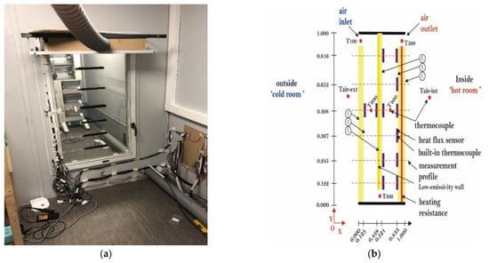 In the context of comparing numerical simulations, experimental data also appear to be essential. Figure 2a,b present the heating window during its instrumentation and integration into the separating wall of two climate cells. The prototype was made of wood and designed for easy glazing removal. The openings for the air inlet and outlet are free rectangular spaces between the top of the interior and exterior glazing and the top of the frame, over the entire width of the window. At the bottom of the window, the air passes under the central pane between two support wedges placed on the sides. These wedges make it possible to hold the central window in place and ensure continuity of the flow in the U-shaped channel thus formed inside the window. It should be noted that these wedges can generate lateral flow disturbances due to a slight narrowing of the air passage. The window is instrumented with T-type thermocouples and heat flux meters (Figure 2a,b). These sensors were placed outside and, more specifically, inside the window along horizontal planes and at several heights. This measurement plan was defined and designed previously for CFD simulations.