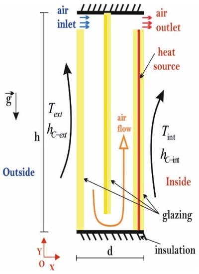 Under a mixed convection mode, the velocity profile is influenced by the temperature difference between the two sides of the heating window. The profile will tend to lean towards the heated side and a counterflow is capable of forming. According to Padet [28], a downward flow occurs near the cold wall when the thermal buoyancy coefficient Re.Ri reaches 288. For a constant air flow, the gravity effects become more pronounced as cavity thickness increases. Indeed, if the Reynolds number remains constant, the increase in cavity thickness “e” is accompanied by a decrease in the velocity “V” in the pipe and a strengthening of gravity effects (i.e., an increase in the Richardson number). In the thermal thrust coefficient, cavity thickness “e” appears with an exponent of three and seems to be the parameter with the greatest influence on the type of convection. If it is being sought to avoid a return flow phenomenon, then it becomes important to maintain a small cavity thickness. In the case of the heating window, flow rates may be higher without risking a cold wall effect, which would cause discomfort. Therefore, the convection is considered herein to be forced; moreover, the velocity profile is assumed to be parabolic at the inlet and symmetrical with respect to the central axis of the cavity. The laminar or turbulent nature of the flow thus depends on the Reynolds number, which varies with air velocity.