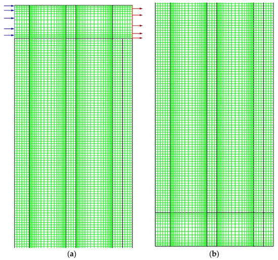 Mesh architecture adopted in the heating window with inlet (blue arrows), outlet (red arrows): (a) upper zone; (b) lower zone.