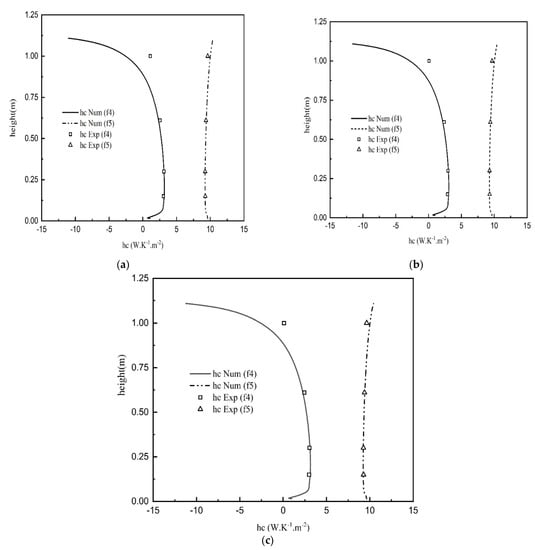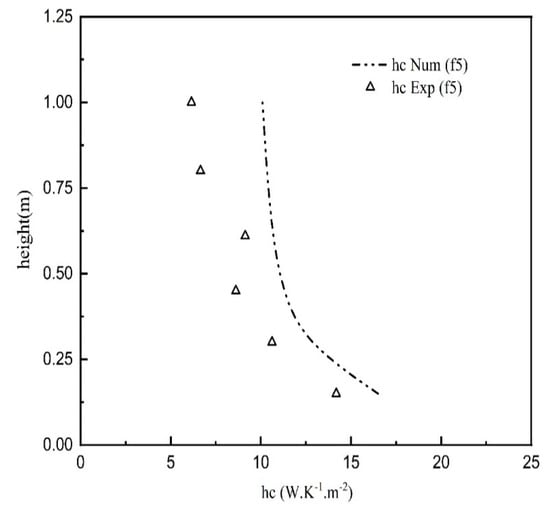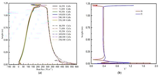 As regards mesh independence, Figure 6a shows the comparison between the heat flux results obtained on face 4 (continuous line) and face 5 (dashed line) for the various grids. It can be noticed that for a mesh density of 46,550 (cells), the evolution of the heat flux curve with respect to face 5 reveals a disturbance in the bottom part of the window. This finding is undoubtedly related to the insufficient meshing over this zone. Beyond this lower zone of the window, all heat flux curves converge towards the same evolution. From a mesh density of 71,050, all curves obtained with respect to faces 4 and 5 yield the same evolution. The relative error between these curves with respect to face 5 remains less than 1%; similarly, the various flux curves obtained with respect to face 4 display an error less than 2%. Based on this sensitivity analysis, we opted for a density of 71,050 cells during the remainder of the simulations.