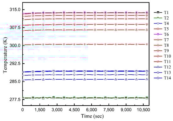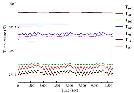 Figure 7 and Figure 8 show the experimental temperature measurements obtained in the window when steady state has been reached with a volume flow rate of Q = 62 m3.h−1 and a power injected into the heating glazing of 475 W.m−2 over a 3 h period. The system initialization phase has been eliminated in order to simplify data analysis. From Figure 7, it can be observed that the air temperature obtained is clearly stable throughout the acquisition period, except for the thermocouples, which had been placed at the center of air gaps, i.e., at the heart of the flow in the window. The recorded signals display some very low-amplitude wave movements due to the temperature variation of the fluid as it passes through the window. It was found that the variation in temperature measurements remains small for the thermocouples, whether placed in the cold cell (Text) or the hot cell (Tin), even for those temperatures recorded in the air gaps. This stabilization of temperature measurements validates the effectiveness of the measuring device designed for the window. As regards the surface temperature measurements on the three panes, the temporal evolutions were recorded in Figure 8. These temperatures were measured by thermocouples integrated into the flux meters and also proved to be very stable.