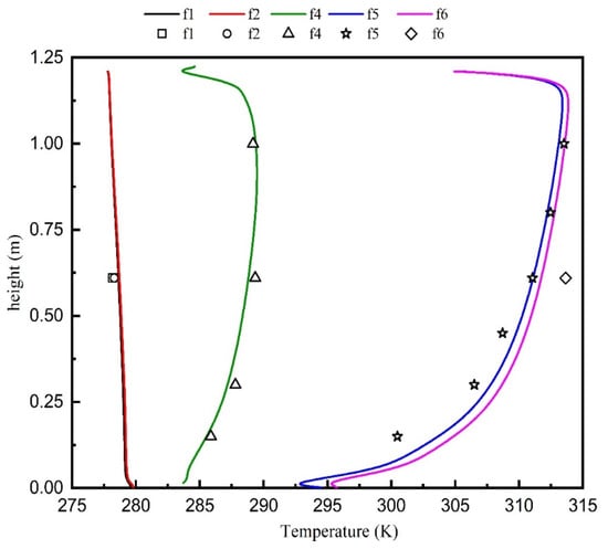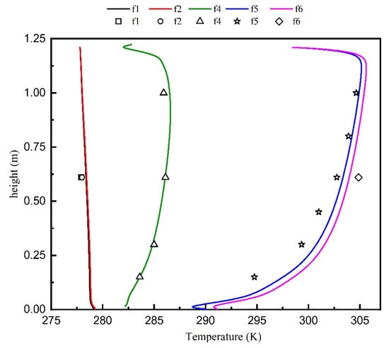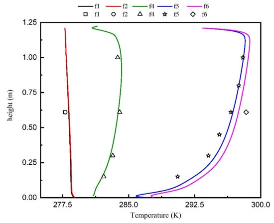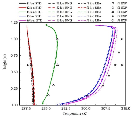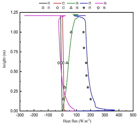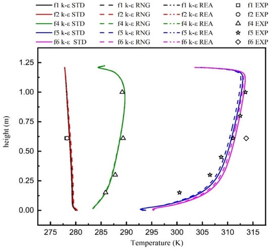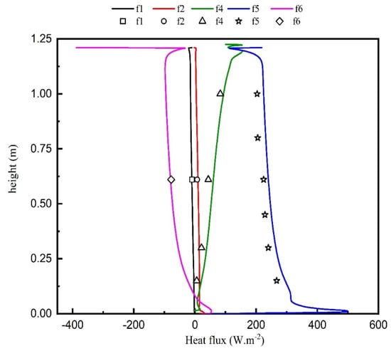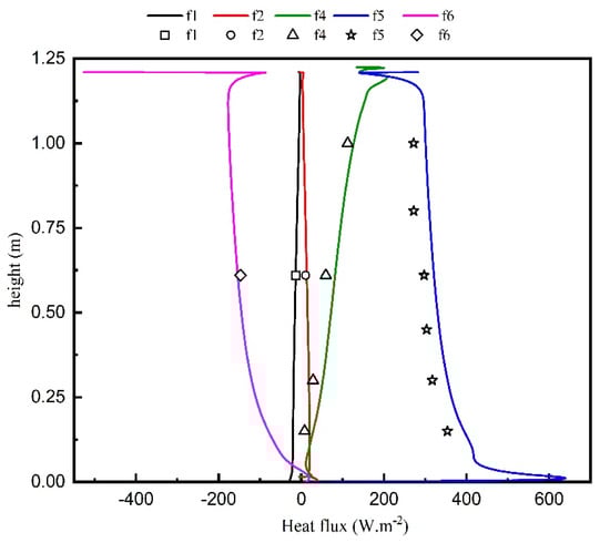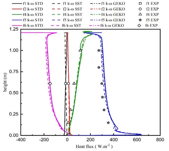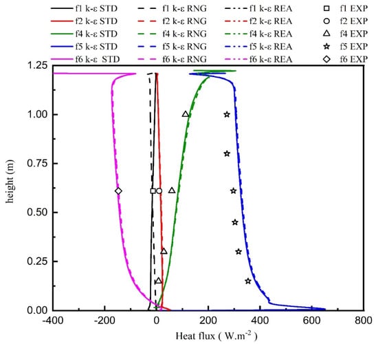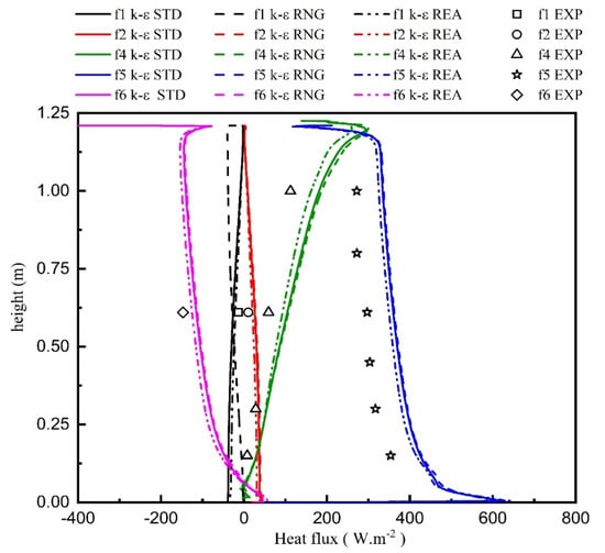 Figure 9 shows the evolution in the experimental and numerical temperatures obtained along faces 1, 2, 4, 5 and 6 of the three panes (see Figure 3). When using k-ε models with a standard wall treatment, some highly significant quantitative differences appear, mainly in comparison to the heated glass (pane numbers 3, f5 and f6). This temperature difference between the experimental and numerical results starts at the bottom of the heated window and increases as it moves towards the window top. For face 6 (f6), in this case, a comparison is nearly impossible, with the temperature differential between the experimental and numerical results lying on the order of 6 °C. For panes 1 and 2 (f1, f2 and f4), the temperature differential, less than previously, is on the order of 2 °C max. For the heat flux results, comparisons of the three k-ε models with a standard wall law are shown in Figure 10; the same remark applies as above, as significant differences are visible on the curves between the experimental and numerical results with respect to the heating pane (f5). On the other hand, at the level of face 6 (f6), the numerical and experimental results are nearly identical, as is the case for faces f1 and f2. Similarly, Figure 10 shows that whichever k-ε model is used with a standard wall treatment, the evolutions in the numerical curves obtained with the three k-ε models are virtually identical, and this applies to the five faces f1, f2, f4, and f5.