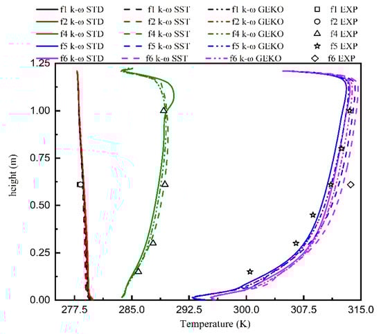Although the former models of two-equation closures in turbulent flows did show some improvement in result accuracy, they are not best suited to the present configuration (Figure 4). Consequently, a new Generalized k-ω (GEKO) adjustable model was recently proposed by ANSYS Inc. (Canonsburg, PA, USA) to cover a wide range of flow scenarios by providing several freely adjustable parameters. Similarly, changing these physical parameters does not affect the thermal and dynamic behavior of the air flow [33]. Publications on the details of the GEKO model are rather limited [34,35]. The GEKO model offers six free parameters that can be calibrated on the basis of experimental data. In the present case, the default values (CSEP = 1.75, CNW = 0.5, CMIX = CMixCor ≈ 0.30 and CJET = 0.9) were applied, which represent, respectively, the flow separation from smooth walls, the heat transfer for near-wall flows, the free shear flow mix, the corner flow separation and the free jet spreading rates.