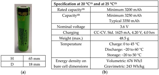 NCA 18650: (a) cell and its dimension; (b) technical specifications.