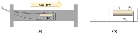 The gas flow (N2 or air) entering the reactor was regulated by a mass flow controller at a constant flow rate of 500 Nml/min. The reactor consists of a cylindrical stainless-steel tube closed at the ends by two removable flanges; on one of them a support was mounted with a cell holder for the 18650 cells (Figure 3a). Three thermocouples (Figure 3b) were positioned inside the reactor and connected to an external data logger. Two thermocouples were located on the cell surface, TC1 (positive electrode side) at 0.5 mm from the venting valve and TC2 (negative electrode side) at 0.5 mm from the cell bottom, while TC3 measured the gas temperature under the cell support. A differential pressure transducer monitored the pressure inside the reactor chamber.