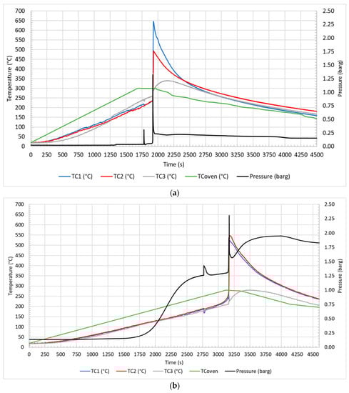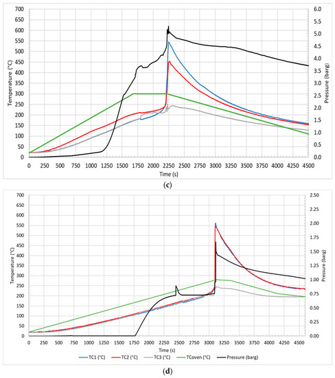 Figure 4 illustrates the profile of temperature and pressure observed during the test in air at 10 °C/min (a) and 5 °C/min (b) and in N2 at 10 °C/min (c) and 5 °C/min (d).