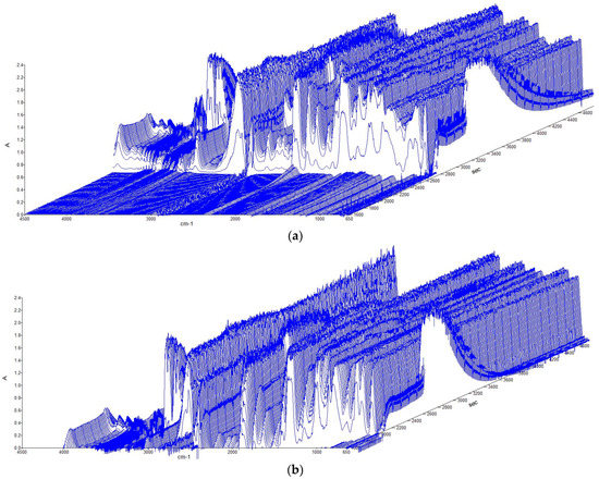 In addition to the increase in temperature and pressure, the heating caused the emission of gases. The spectra obtained from the FT-IR spectrometer during the tests performed at 5 °C/min in air (a) and in N2 (b) are reported in Figure 5.
