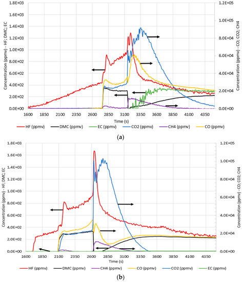 From the concentration profiles, it is possible to notice that the first released gas was HF after the CID activation at 1672 s (Figure 6a) and 1754 s (Figure 6b). The other gases (CH4, CO, and CO2) and DMC and EC vapors were instead emitted from the venting phase, and a sudden increase in their concentrations corresponding to TR was observed, except for DMC in the case of air (and DMC and CO in the case of N2) that first decreased and then increased again. The maximum concentration values of HF (1300 and 1700 ppmv) were reached at the maximum temperature both in air and N2, respectively. This was similar for CO (35,000 ppmv) and CO2 (100,000 ppmv) in N2 but not in air, where the maximum concentrations of CO (60,900 ppmv) and CO2 (90,000 ppmv) were shifted after the peak temperature. This behavior gave evidence of the combustion outside the cell of the gases emitted during TR. From the profile of each gas, it was possible to observe that the emitted amount of HF, DMC, and EC were not significantly affected by the test conditions. DMC and EC were the main electrolyte solvents, while HF was due to the decomposition of the electrolyte salt, LiPF6 [7]. The CO and CO2, on the other hand, were strictly dependent on the test conditions; in fact, in air, the total amount of CO2 was higher (1–13 times depending on the heating rate) than the total amount of CO, while in nitrogen, it was the opposite. Even the CH4 production was dependent from the operating conditions.
