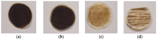 PTFE filters sampled after testing: (a) 10 °C/min in air; (b) 5 °C/min in air; (c) 10 °C/min in N2; (d) 5 °C/min in N2.
