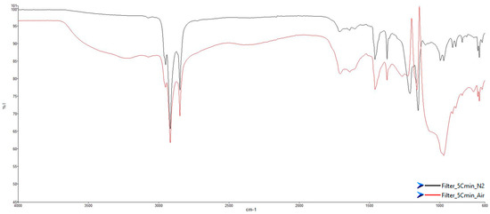 Comparing the two spectra, it was possible to notice a difference in the transmittance (%T); in fact, the spectrum acquired on the sample obtained in air (red line) had lower transmittance values with more intense peaks (strong, s). By comparing the low wavenumbers range, between 1000 and 600 cm−1, it emerged that in air, there was a loss of information due to a huge number of unique peaks with a very low transmittance values, %T around 60%, instead of different peaks with small or medium intensity. The loss of information was attributable to the brown deposit on the filter, which caused a high absorbance of the IR wave in the range close to the visible spectrum.