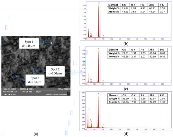 The chemical composition and diameters of the particles observed in the sample of Figure 11 were homogeneous. In fact, they had the same chemical composition: Al, O, F, and P with a similar percentage relationship among the investigated spots and comparable diameters, d1 = 1.48 µm, d2 = 1.04 µm and d3 = 2.54 µm, between the different particles. The presence of F and P was common and was traceable to the electrolyte solution in which the Li-salt (LiFP6) was dissolved in organic carbonates (i.e., DEC and EC). The presence of lithium could not be verified by this analysis; in fact, SEM-EDX only detected Z > 3; Li was too light and could not be detected for the very low energy of the characteristic radiation. The presence of Li was demonstrated by the ICP and AAS analysis later reported. Al and O were instead attributable to the composition of the cathode made of lithium nickel cobalt aluminum oxides (NCA). The presence of C was due to the initial treatment of the sample, graphitization, so it was therefore not possible to distinguish it from the graphite of the anode material.