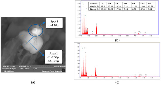 The agglomerate in Figure 12a could be divided into two distinct particles, the upper one with d = 1.10 µm and the inferior one with d1 = 2.55 µm and d2 = 1.78 µm. The main difference between the two in terms of composition was the presence of Al in the upper one and a greater amount of oxygen in the inferior one. Moreover, in that case, P and F were found and attributable to the electrolyte salt, while the material coming from the electrodes, specifically the cathode, was confirmed by the copresence, in Spot 1, of Ni, Co, and Al, presumably in oxidized form, and in Area 1 by the copresence of Ni and Co.