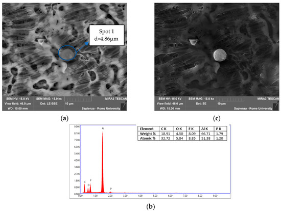 Also in this sample, Figure 14 shows a spherical particle, with d = 4.86 µm, composed mainly of Al, in the form of an oxide due to the copresence of O, and F and P attributable to the electrolyte solution.