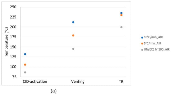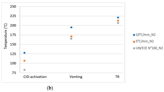 The temperature and pressure values of the key events for the different thermal abuse test conditions, reported in Table 3, were compared with the values obtained by the thermal stability test, the UN/ECE Regulation No. 100 [15]. Figure 15 illustrates the comparison of the results (a) in air and (b) in N2 for the temperature of the key events: CID activation, venting, and TR.
