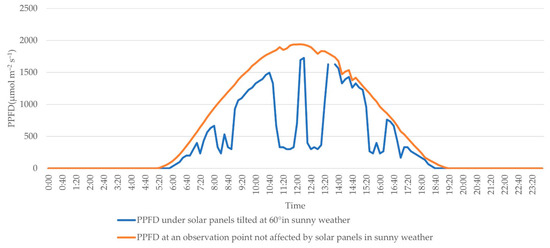 Difference in PPFD above and below solar panels. From Yajima et al. [50].
