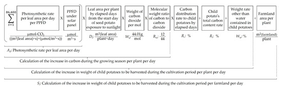 Germinated seed potatoes were planted in the field. The expansion of leaf area grown from seed potatoes accumulates nutrients in the potatoes to be harvested. The expansion of leaf area of taro is unaffected by shading [55]. The growth of its leaf area and carbon distribution to each organ by photosynthesis results from the elapsed days of growth inherent in the plant, regardless of the amount of solar irradiation. Therefore, this study established the model to estimate the growth of child potatoes as potatoes to be harvested based on the increase in carbon accumulation calculated from the amount of solar irradiation absorbed by increasing leaf area.