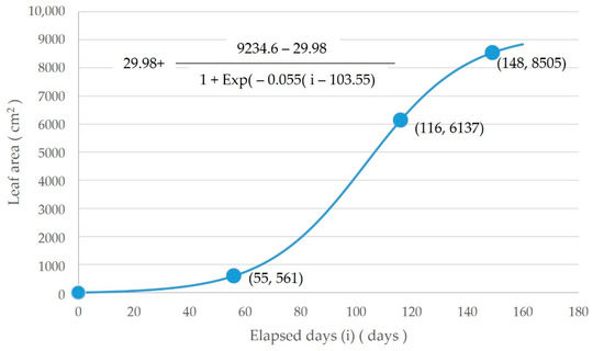 In the present study, the dry weight (g/individual) of leaves was measured on June 18 before enlarging seed potatoes, on August 18 at the beginning of enlarging of grandchild potatoes grown further from the child potatoes to be harvested and September 19 at the beginning of enlarging of great-grandchildren. Dry matter weight increase and leaf area are proportional; the leaf area in total seed grown potatoes and child potatoes on the 150th day after exposing seed potatoes to sunlight is 8505 cm2 [56]. The leaf area by elapsed day per plant after exposing the seed potatoes to sunlight was empirically represented using the 4-parameter logistics curve, which was created using three inflection points starting from zero, based on Sugimoto [56] (Figure 4).