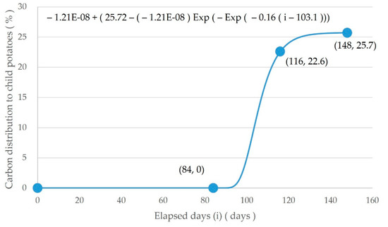 Rc (0 <) is the carbon distribution rate to child potatoes by elapsed days. The growth-related changes in 13C-photosynthetic product distribution in toba [57] did not describe the timing of exposing the seed potatoes to sunlight; therefore, the same method as the previous estimation of the leaf area per plant was adopted. This study assumed that the seed potatoes were exposed to sunlight on April 24, 1991. From the above assumptions, the change in the rate of carbon increases according to the growth of child potatoes was empirically represented by the 4 parameters of the Gompertz curve. Therefore, Figure 5 was created using three inflection points starting from zero, based on the method of Sugimoto [56]:
