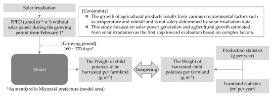 We developed a model that calculated the photosynthetic photon flux density (PPFD) under solar panels by solar irradiation [50]. This study establishes a model using PPFD calculated by solar irradiation to determine the correct cultivation start date to ensure an ideal harvest period for specific crops under solar panels in order to maintain agricultural production without delaying the harvest period combined with an existing model that calculates the amount of electricity generated by solar panels based on solar irradiation.