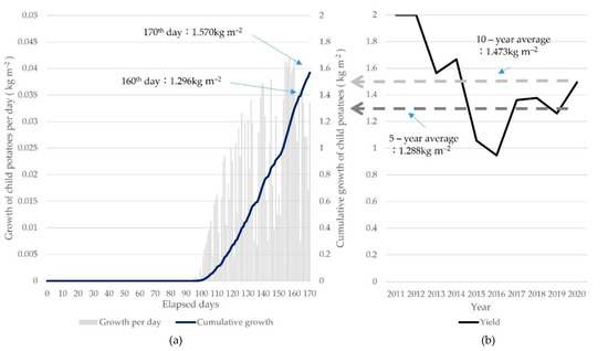 The proposed model calculated the yield of child potatoes on the 160th day to be 1.296 kg m−2 and on the 170th day to be 1.570 kg m−2 (Figure 7a). The values calculated by the model were derived to have a difference of less than 1% from the average of the last 5 years calculated by the statistics.