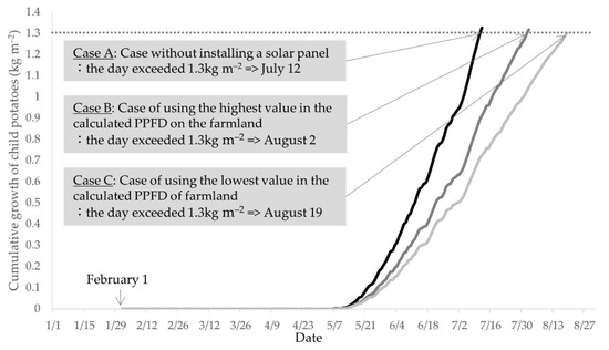 July 12 was the calculated date when child potato growth weight exceeded 1.3 kg m−2 (the standard weight for harvesting) in Case A. In comparison, the calculated harvest start date was delayed by 21 days to August 2 for Case B, and by 38 days (August 19) for Case C (Figure 8).
