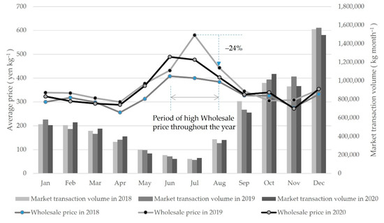 Monthly market transaction volume and average wholesale price of taro in the Tokyo Central Wholesale Market for the past three years (Adapted with permission from Ref. [59]. 2022, Metropolitan Central Wholesale Market of Japan).