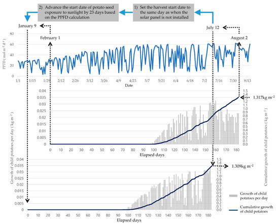 The harvests start date for case A without installing a solar panel is on July 12. Aligning harvest date with Case A, the proposed model recommended bringing the start date of exposing the seed potatoes to sunlight forward from February 1 to January 9 for Case B (Figure 10). Although it is necessary to consider other environmental conditions and cultivation methods according to optimize the date of exposing the seed potatoes to sunlight, the model provides a useful guideline date.