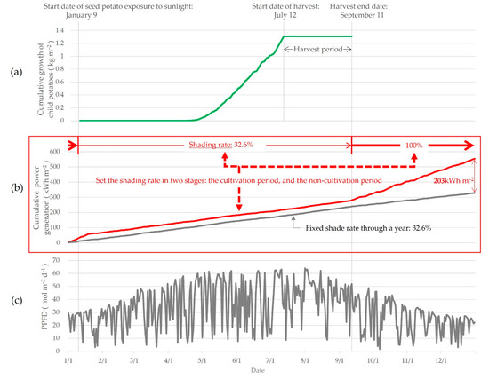 Difference in cumulative power generation for different shading rates set depending on growing conditions (b), cumulative growth of child potatoes (a), and PPFD changes (c).