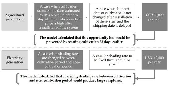 The additional power generation gained by changing the shading rate according to the stage was calculated at 203 kWh m−2 for 10,000 m2 of farmland. This economic value amounted to 16.2 million yen (approximately USD 142,000) per year. Depending on the cost associated with solar panel relocation (including labor costs), there is a considerable profit to farmers (Figure 11). A summary of the values estimated by the model for 10,000 m2 of farmland is provided in Figure 12.