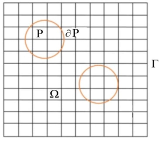 The fluid density and particle density are ρf and ρp, respectively; the viscosity from the contribution of non-Newtonian fluid and solvent viscosity are μp and μs, respectively; the particle volume and moment of inertia are Vp and Jp, respectively; and the particle velocity and angular velocity are Up and ωp, respectively. P and Ω are used to represent the particle domain and whole simulation domain, respectively, consisting of particle and fluid as shown in Figure 2, where ∂P is the boundary of particle.