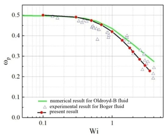 For verifying the feasibility of the method used here, we compared the present numerical results of particle angular velocity in a three-dimensional shear flow of an Oldroyd-B fluid, with the numerical results using the finite-element method and experimental data for the Boger fluid [] as shown in Figure 3. It can be seen that the three match well.