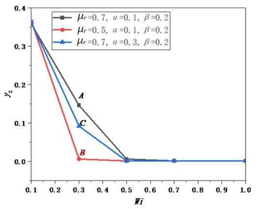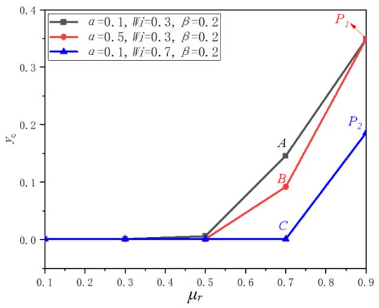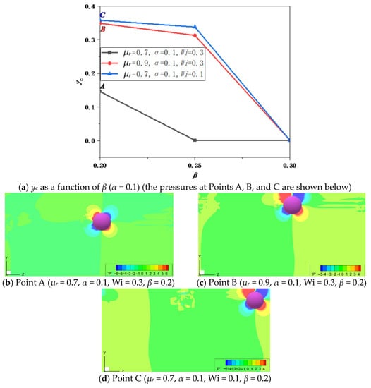 yc as a function of β for different values of μr and Wi is given in Figure 10a, where we can see that β has a large effect on the particle migration direction. For β = 0.2, the values of yc are 0.146 (Point A), 0.35 (Point B), and 0.358 (Point C), while the values of yc are 0.001 for the three cases at β = 0.3, i.e., particle will migrate towards the wall for β = 0.3. The values of yc decrease with the increase in β, although the change trend of yc with β is different under different parameters. The particle is more inclined to migrate towards the wall with the increase in β. For fixed μr, the value of yc increases with decreasing Wi; for fixed Wi, the value of yc rises with increasing μr. Therefore, the particle is more inclined to migrate towards the wall at large Wi and small μr.