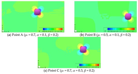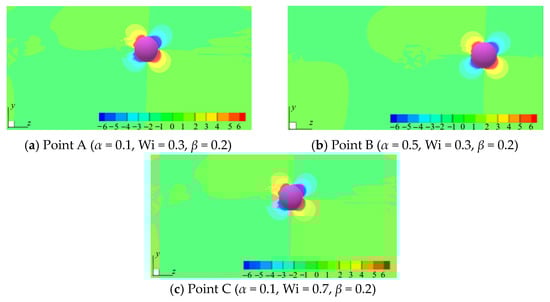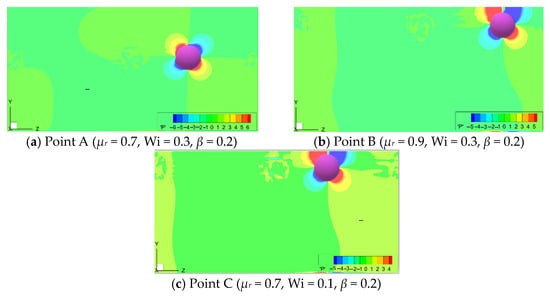 The pressure contours for the three cases in Figure 4 are shown in Figure 5. The pressure is normalized with the average pressure, and positive and negative values indicate the pressures that are greater than or less than the average pressure. The figure shows the pressure distribution of a certain instantaneous flow, and the subsequent movement of particle is determined by the force acted upon the particle by the fluid that is linked to the instantaneous pressure distribution. The particle will migrate towards the region with lower pressure at the next moment. Comparing Figure 5a–c, we can see that the pressure distributions of the three cases are similar, indicating that α and Wi have little influence on the pressure distribution at the same β and μr.