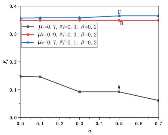 Wi is used for representing the relative importance of elastic and viscous force []. Figure 8 displays yc as a function of Wi for different μr and α. It can be seen that the values of yc are large (from 0.358 to 0.365) at Wi = 0.1, while they are small (≤ 0.006) for 0.5 < Wi < 1.0; the values of yc decrease with the increase in Wi in the range of 0.1 < Wi < 0.5, indicating that the particle is more inclined to migrate towards the wall with the increases in Wi, and the effect of Wi on the particle migration direction is obvious. For fixed α, the value of yc rises with the increase in μr; for fixed μr, the value of yc rises with the decrease in α. Therefore, the particle is more likely to move towards the wall at small μr and large α.
